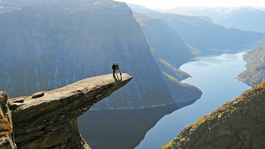 - Trolltunga: One of the most awe-inspiring cliffs in Norway, situated about 1,100 meters above sea level and hovering some 700 metres above Lake Ringedalsvatnet. Trolltunga juts out at right angles to the mountainside, like a huge troll’s tongue carved in stone. It has been there for thousands of years, just waiting for you to make your way to its edge and to admire the fantastic views.