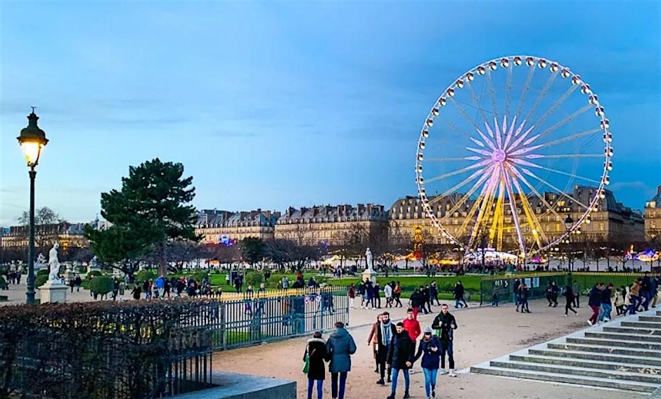 The most iconic Paris Christmas village, filled with glowing chalets, festive rides, gourmet food, vin chaud, and a giant Ferris wheel offering magical winter views of the city.